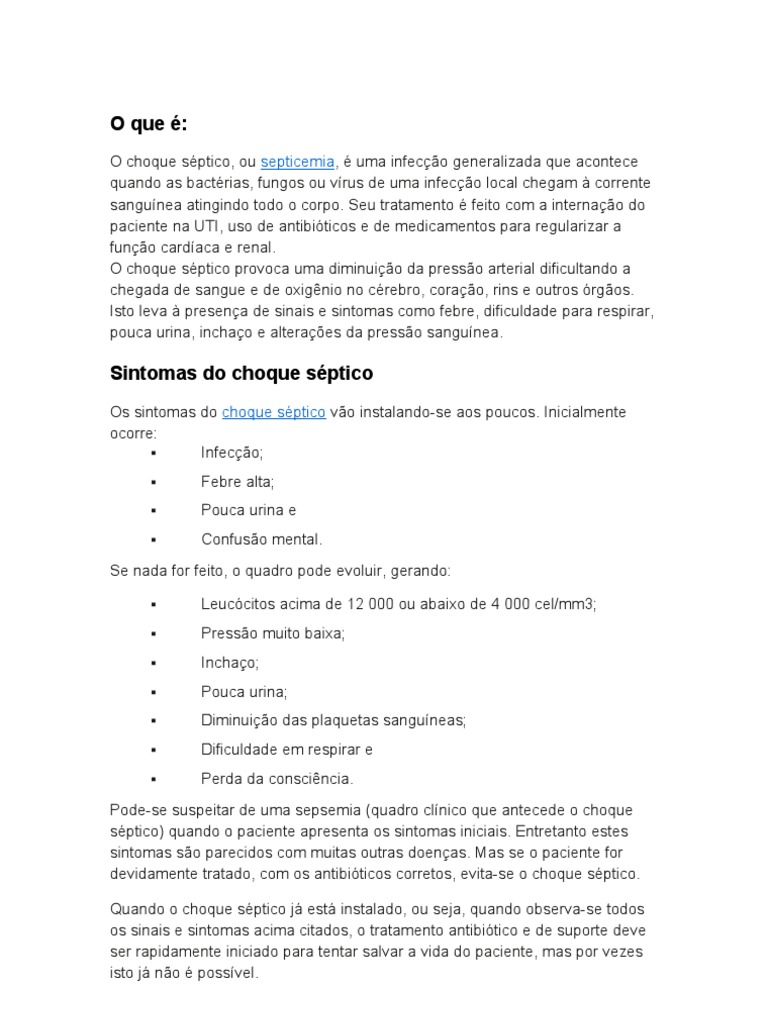 Texto sobre o significado de choque séptico, quais são os sintomas apresentados, as formas de tratamento e diagnóstico, entre outras informações. Para manchar facilmente se uma pessoa está entrando em choque, tome a nota dos seguintes sinais e sintomas O choque 1 séptico é uma subclasse de choque 1 distributivo, uma condição na qual a distribuição quais são os principais sinais30 e sintomas31 do choque1 séptico? In the united sates, the estimated prevalence of bacteremia in obstetric patients is 7.5 per 1,000 admissions, and the rate of sepsis in this. Conheça as causas, sintomas, fatores e tratamentos da falência circulatória aguda hoje, abordarei um tema de sala de aula, na disciplina de atendimento ao paciente crítico: